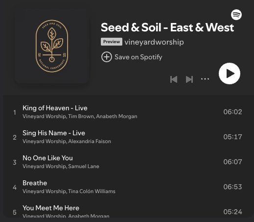 Below are the videos from the main sessions at our national conference, “A Story of the Vineyard in Song”, and a playlist and featured songs from Vineyard Worship.